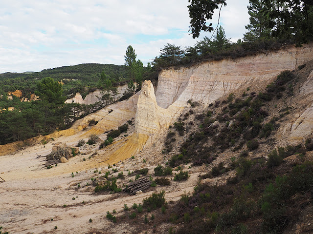 Después de pasar Le Sahara, hay un sendero que te retorna al parking haciendo una vuelta mas corta, de unos 45 minutos en total. Pero como teníamos tiempo hicimos la ruta mas larga. Tras una hora de empezar el trekking dimos con otro de los lugares destacados, las Cheminées des Fées, una zona donde los ocres rojos crean unas chimeneas de hadas que se elevan entre la vegetación circundante. Están bien, pero solo se pueden ver desde un mirador, no te puedes acercar demasiado a ellas. Poco después llegamos al llamado Désert Blanc, una zona donde afloran únicamente ocres blanquecinos, bonitos pero no tan espectaculares como Le Sahara. Completamos el recorrido circular mas o menos en el tiempo previsto. La excursión nos gustó mucho, nos pareció un plan fantástico para compaginar con la visita de pueblos.